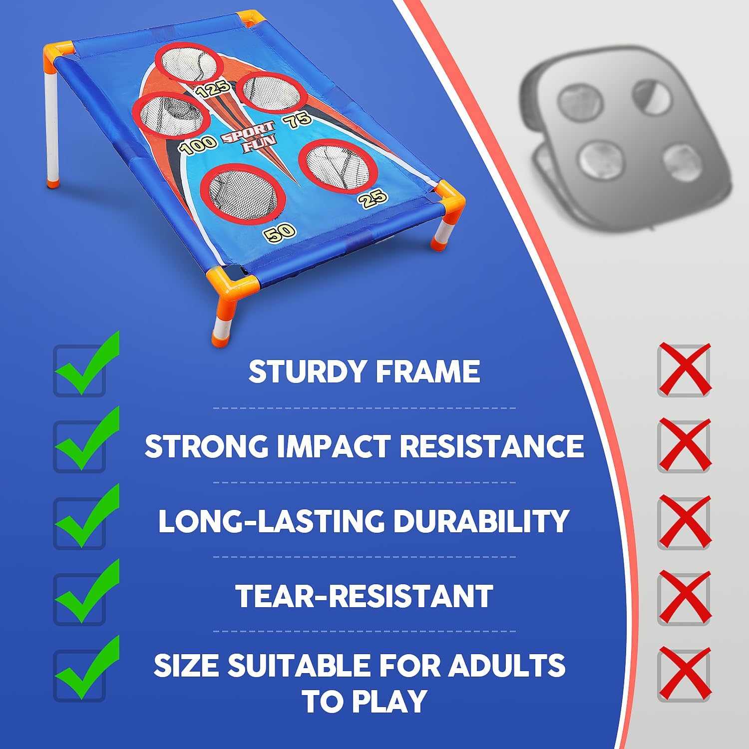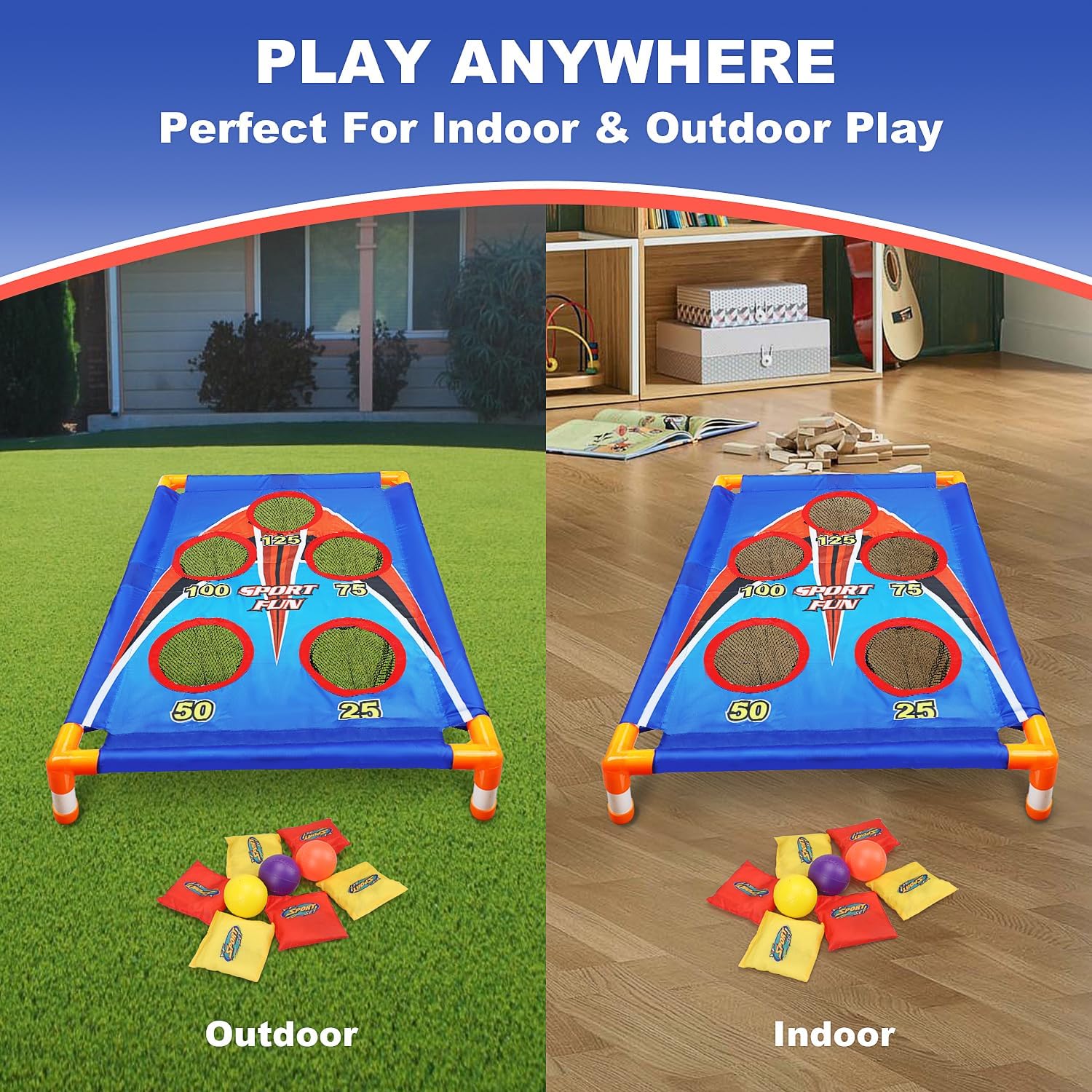 - ⚾ COMPREHENSIVE SKILLS IMPROVEMENT – With this kids outdoor games cornhole toss game, kids can reinforce simple math skills, hand-eye coordination, and team spirit while having their indoor cornhole set game set fun.