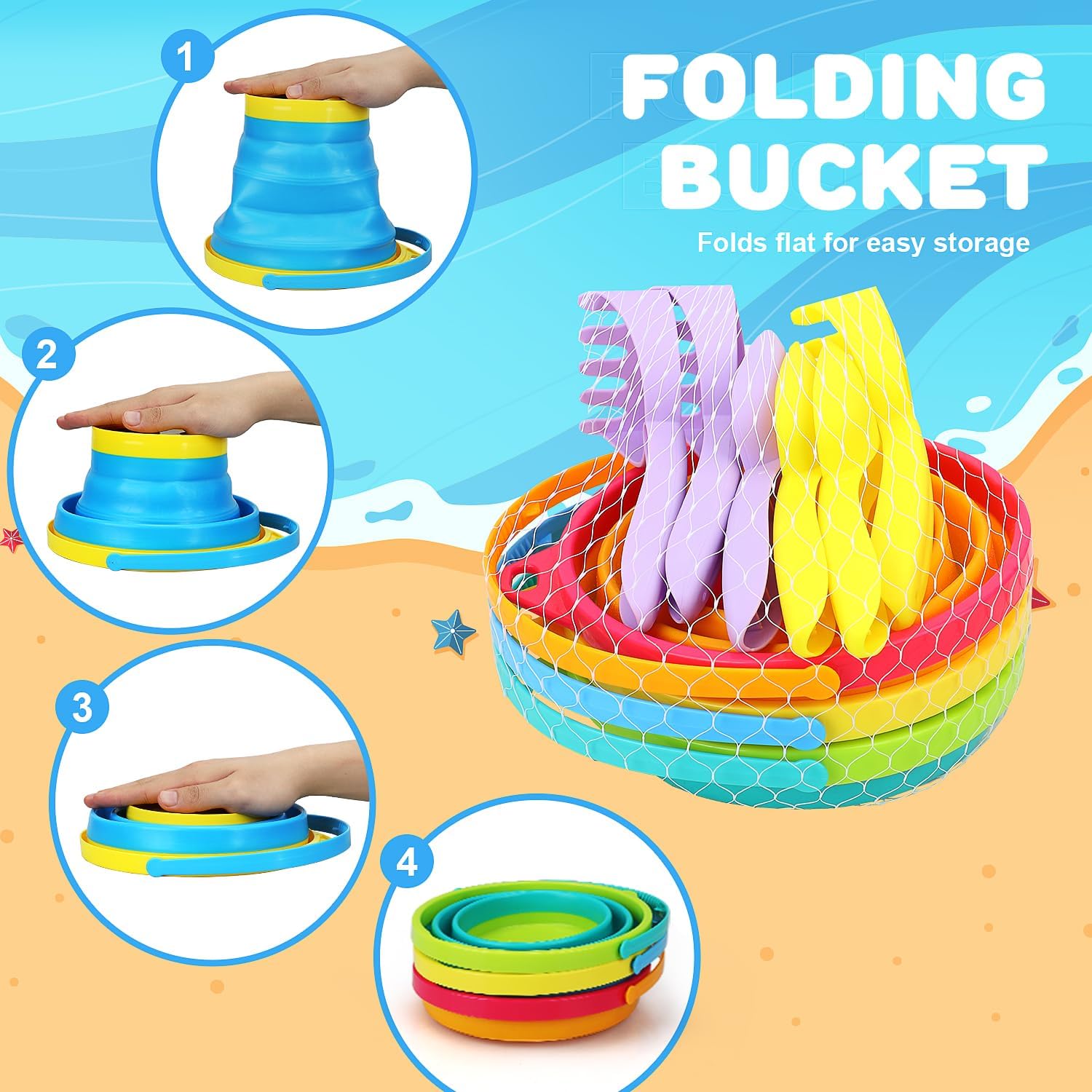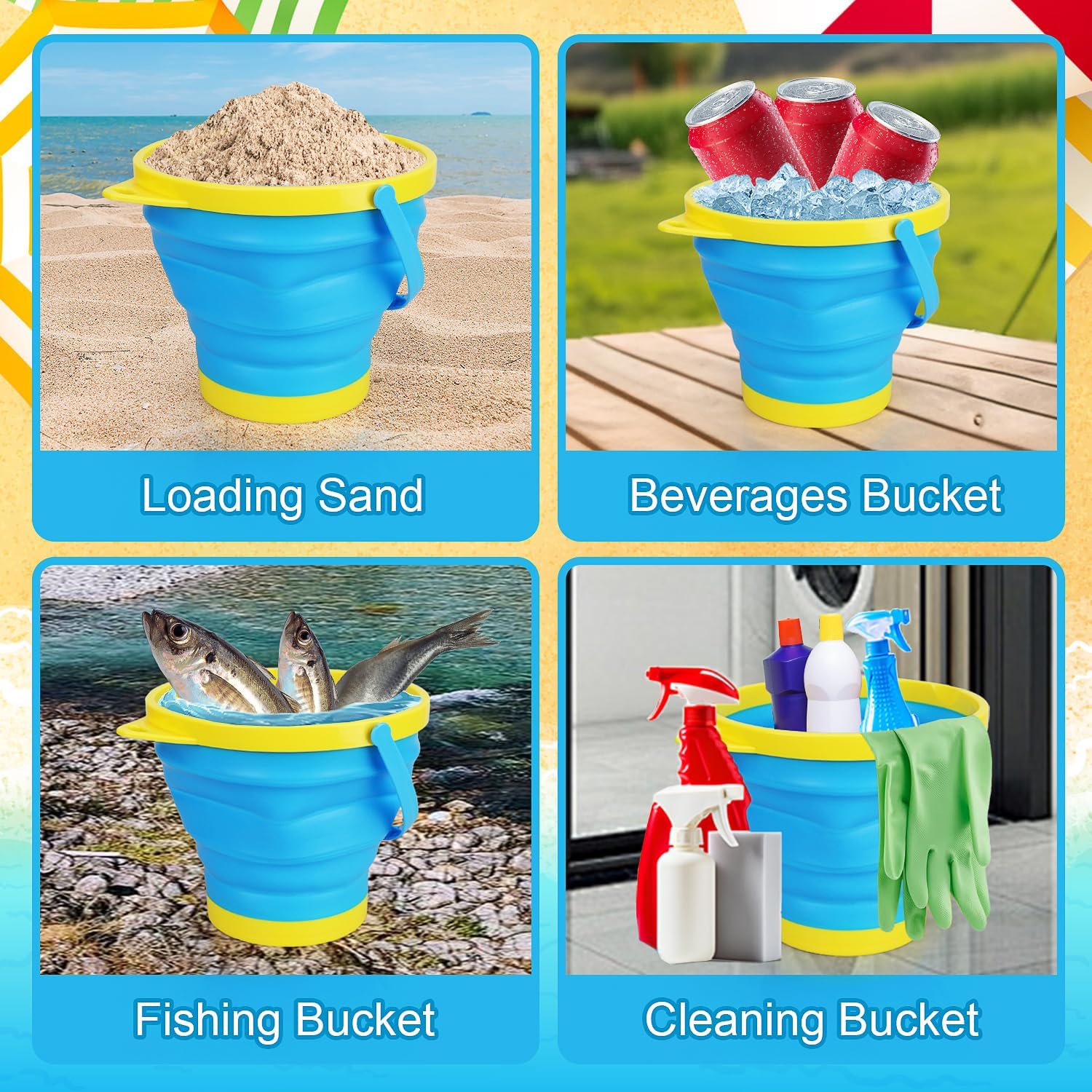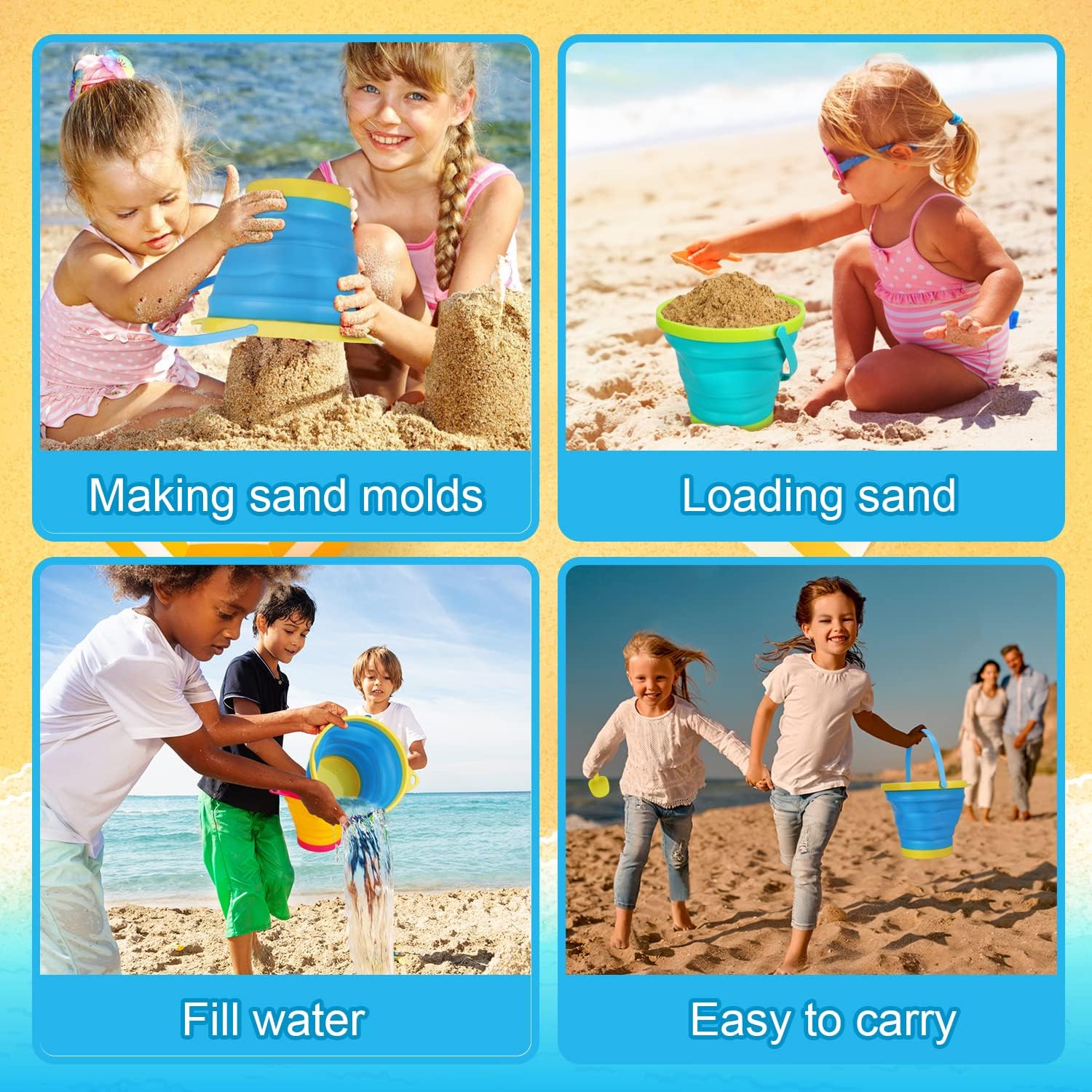 - 🪣MULTI-FUNCTION COLLAPSIBLE BUCKETS – To make your beach trip more light and portable, we use the compressible bucket, reduce the weight of the child can also lift, the sand toy compressible bucket is made of silica gel, soft and not harmful to children. Kids can not only use the bucket for beach fun but also can be used in the daily routine like washing the car, watering the flowers, cleaning the house.
