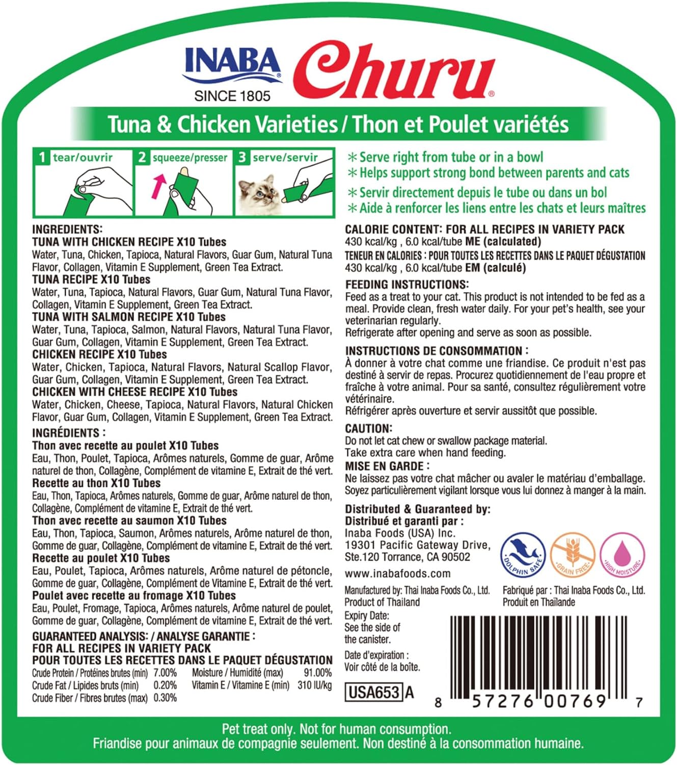 Tuna with Chicken Recipe 10 tubes : Water, Tuna, Chicken, Tapioca, Natural Flavors, Guar Gum, Natural Tuna Flavor, Vitamin E Supplement, Green Tea Extract. Tuna Recipe 10 tubes : Water, Tuna, Tapioca, Natural Flavors, Guar Gum, Natural Tuna Flavor, Vitamin E Supplement, Green Tea Extract. Tuna with Salmon Recipe 10 tubes : Water, Tuna, Tapioca, Salmon, Natural Flavors, Guar Gum, Natural Tuna Flavors, Vitamin E Supplement, Green Tea Extract. Chicken Recipe 10 tubes : Water, Chicken, Tapioca, Natural Flavors, Natural Scallop Flavor, Guar Gum, Vitamin E Supplement, Green Tea Extract. Chicken with Cheese Recipe 10 tubes : Water, Chicken, Cheese, Tapioca, Natural Flavor, Natural Flavors, Guar Gum, Vitamin E Supplement, Green Tea Extract.