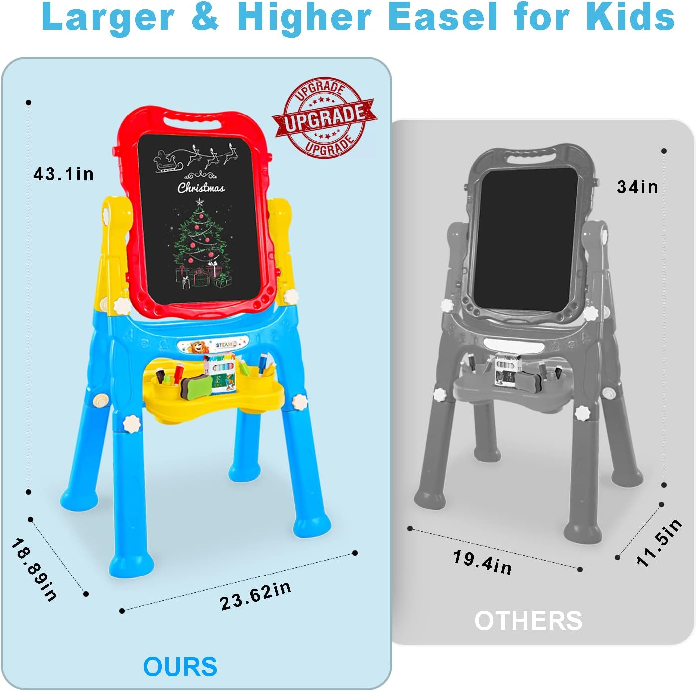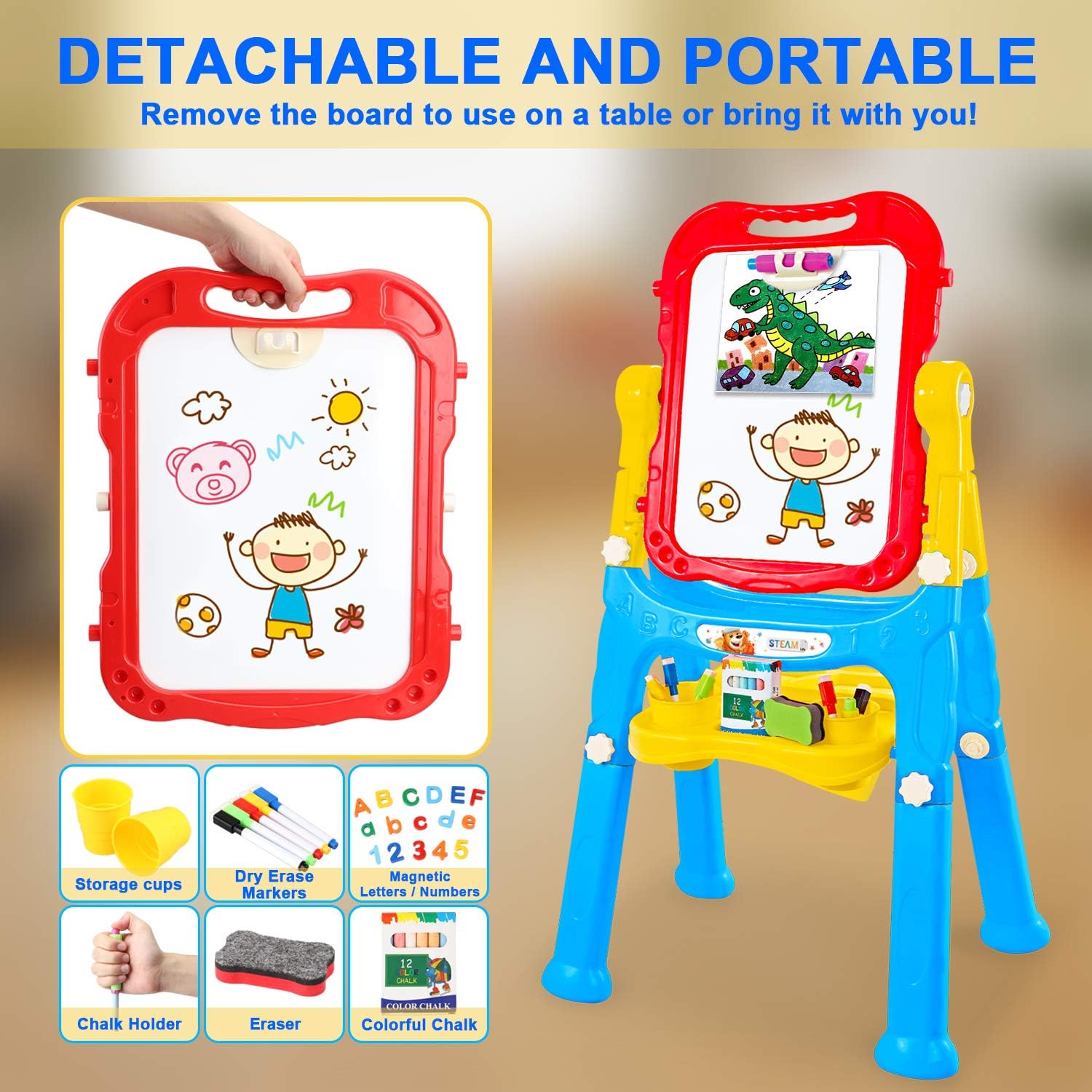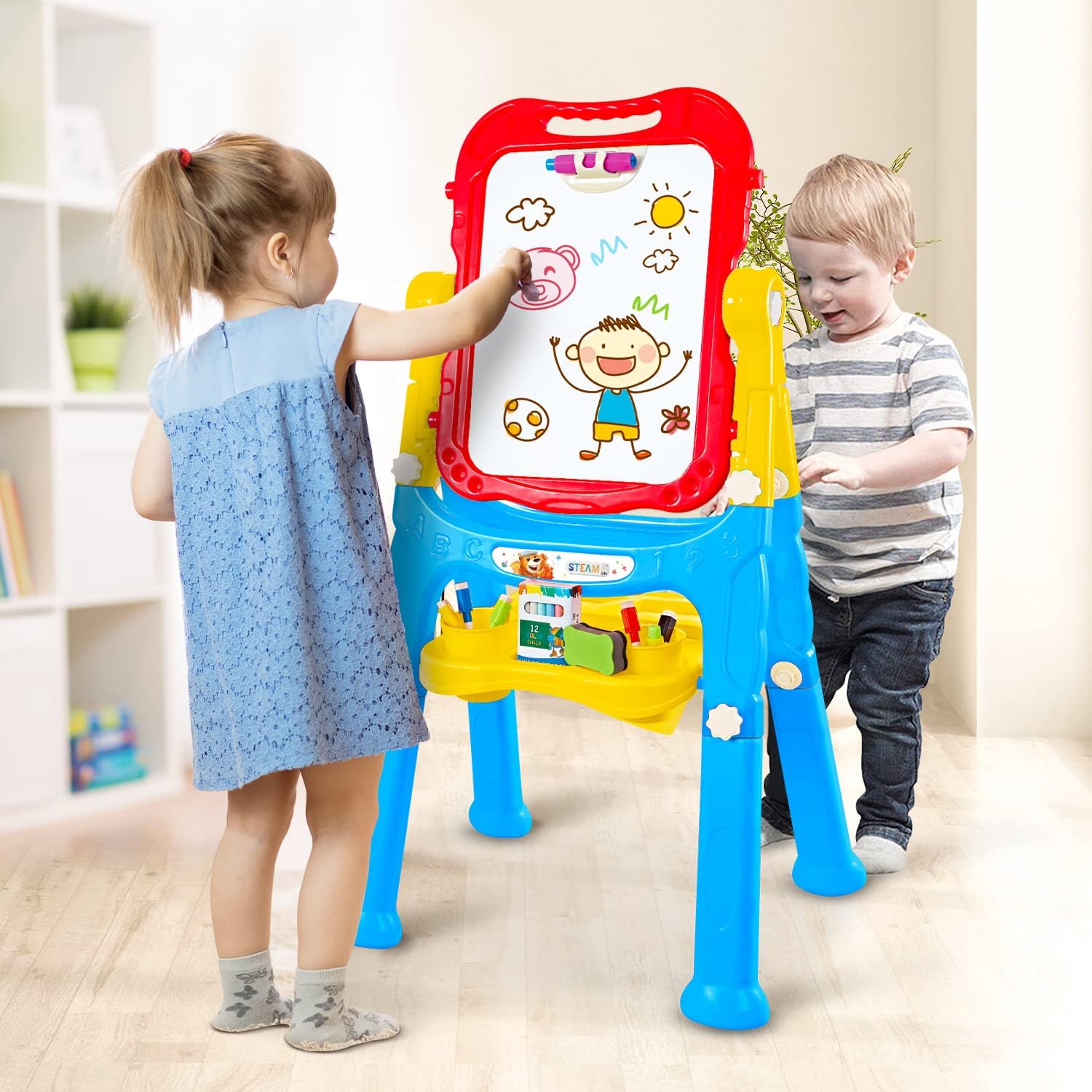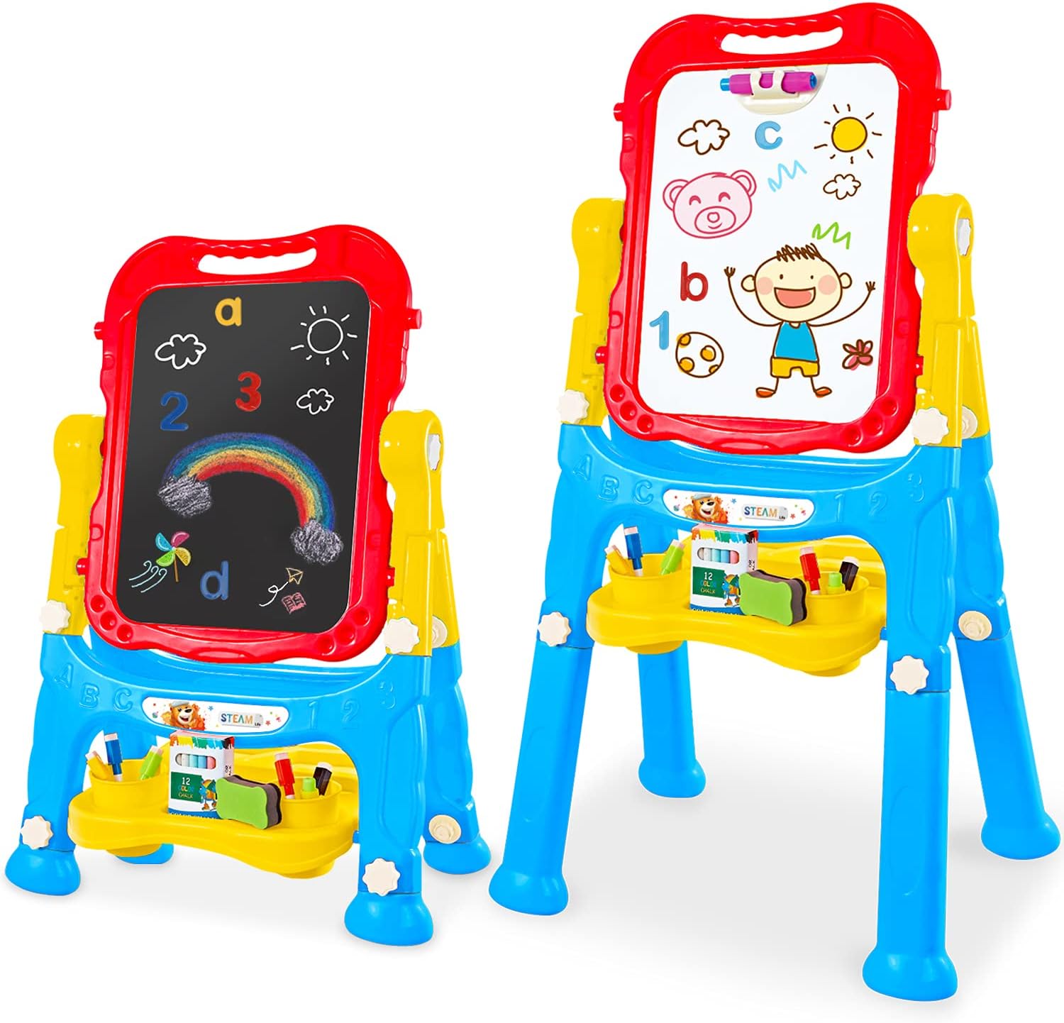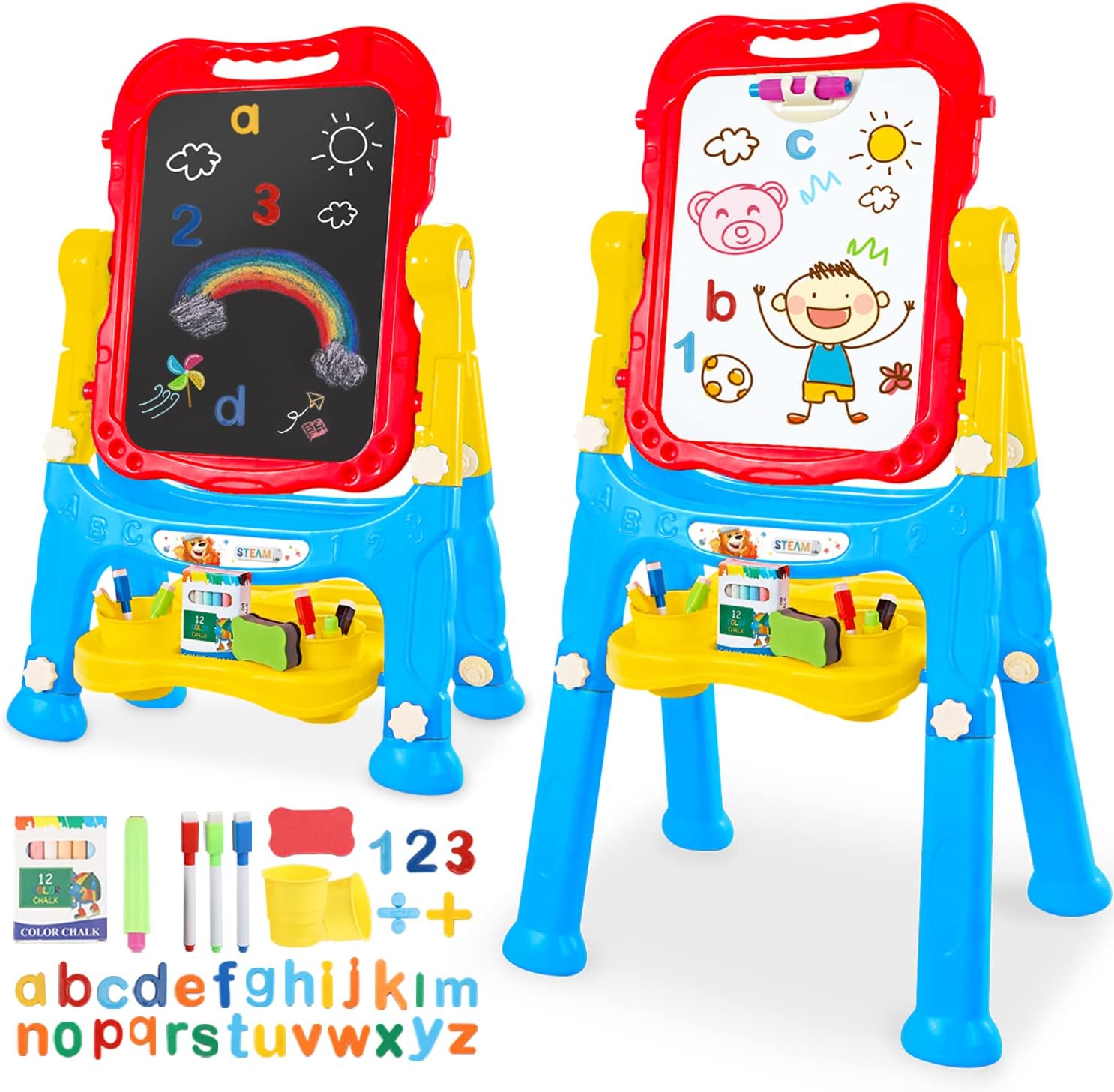 • 🎨 PERFECT PRESENT, EVERYTHING INCLUDED: This Art Easel for kids 3-4 bears two sides, a chalkboard, and a magnetic dry erase board for kids on the other side. This 4-in-1 chalk board for Kids comes with magnetic numbers and letters, chalk, coloring markers, an eraser for the dry erase board and chalkboard. This makes the perfect holiday or birthday gift for your little one.