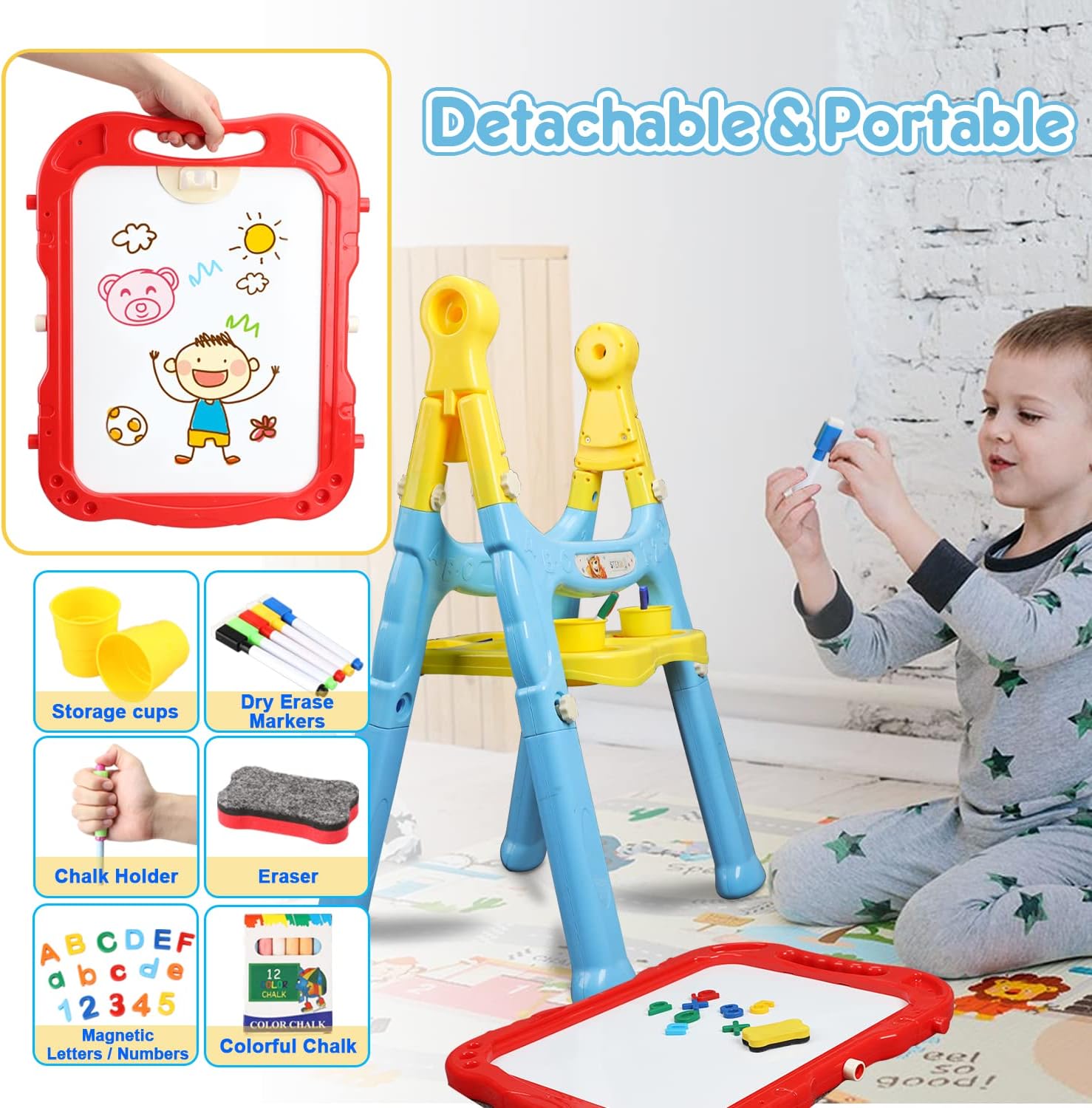 • 🎨 Sturdy Double-Sided Kids Easel: This sturdy kids easel for toddlers 3-4 years includes two sides, which can keep two or multiple kids busy at the same time and help your little one easily establish friendships with other children. With this sturdy chalkboard for kids, your kids can express their feelings easily in a multi-dimensional way.