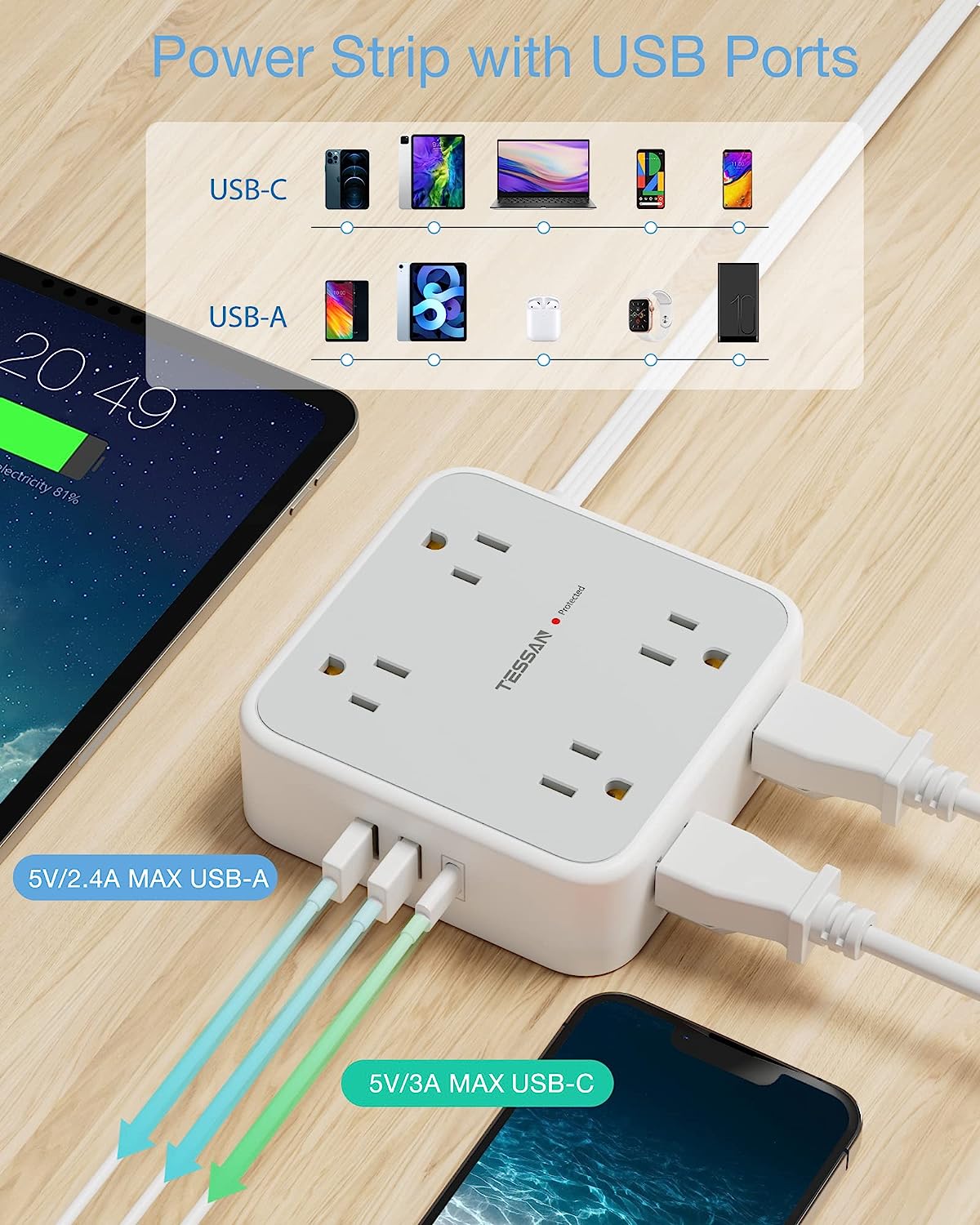- Multiple Outlets: 8 widely spaced outlets provide ample space for multiple devices and adapters to be plugged in simultaneously without blocking adjacent outlets.3 USB chargers, including 1 USB C port, allow for convenient charging of smartphones, tablets, and other USB-powered devices without the need for additional adapters